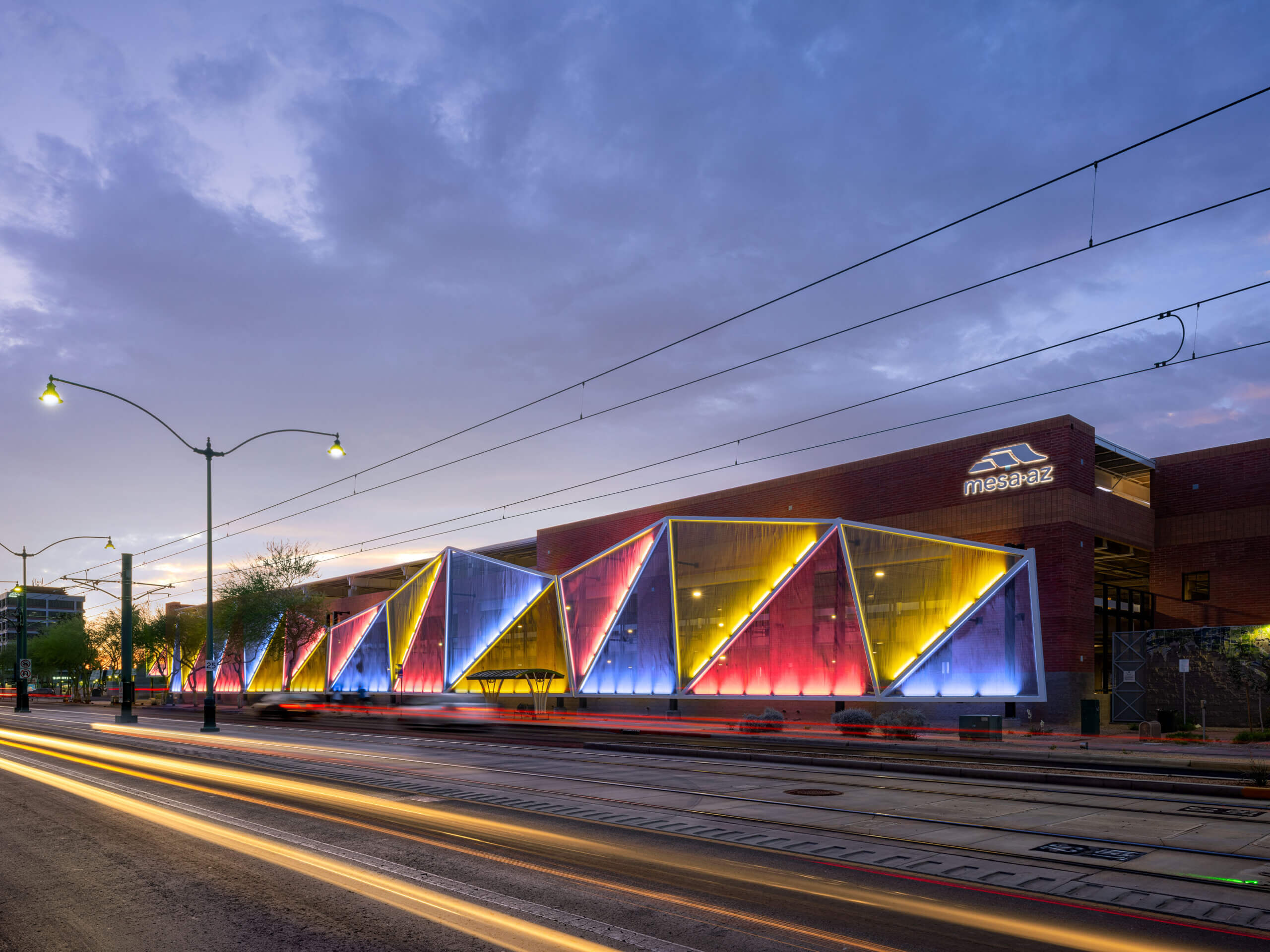 Bringing a distinctive glow and sculptural style to the corner of N Hibbert & E Main while securing the building, the parking structure's retrofit, custom architectural metal mesh facade system utilizes over 11,000 sq ft of 1/2" 13 ga Stainless Steel Fabricoil® Coiled Wire Fabric for the primary architectural metal mesh cladding/screening material.