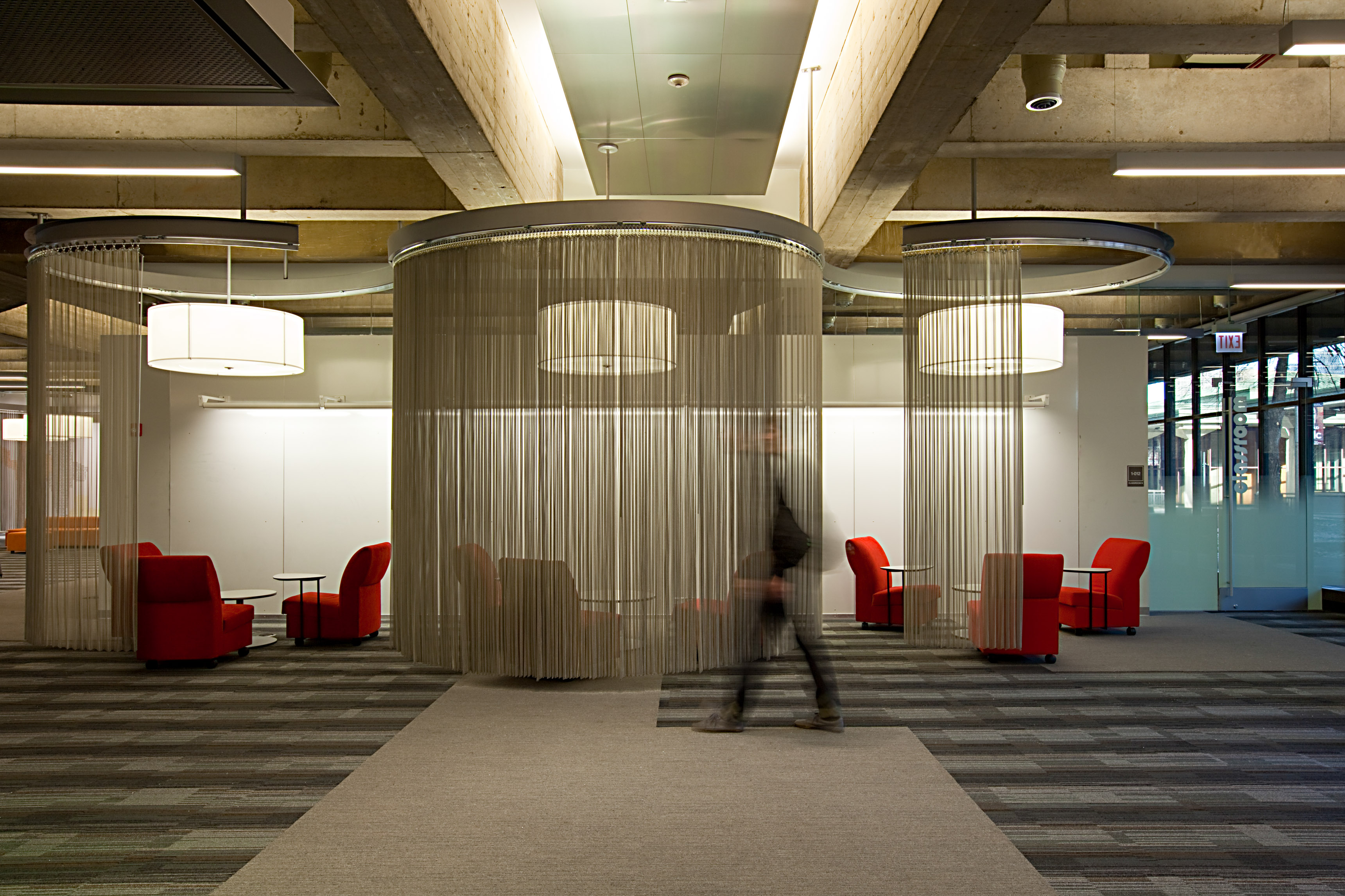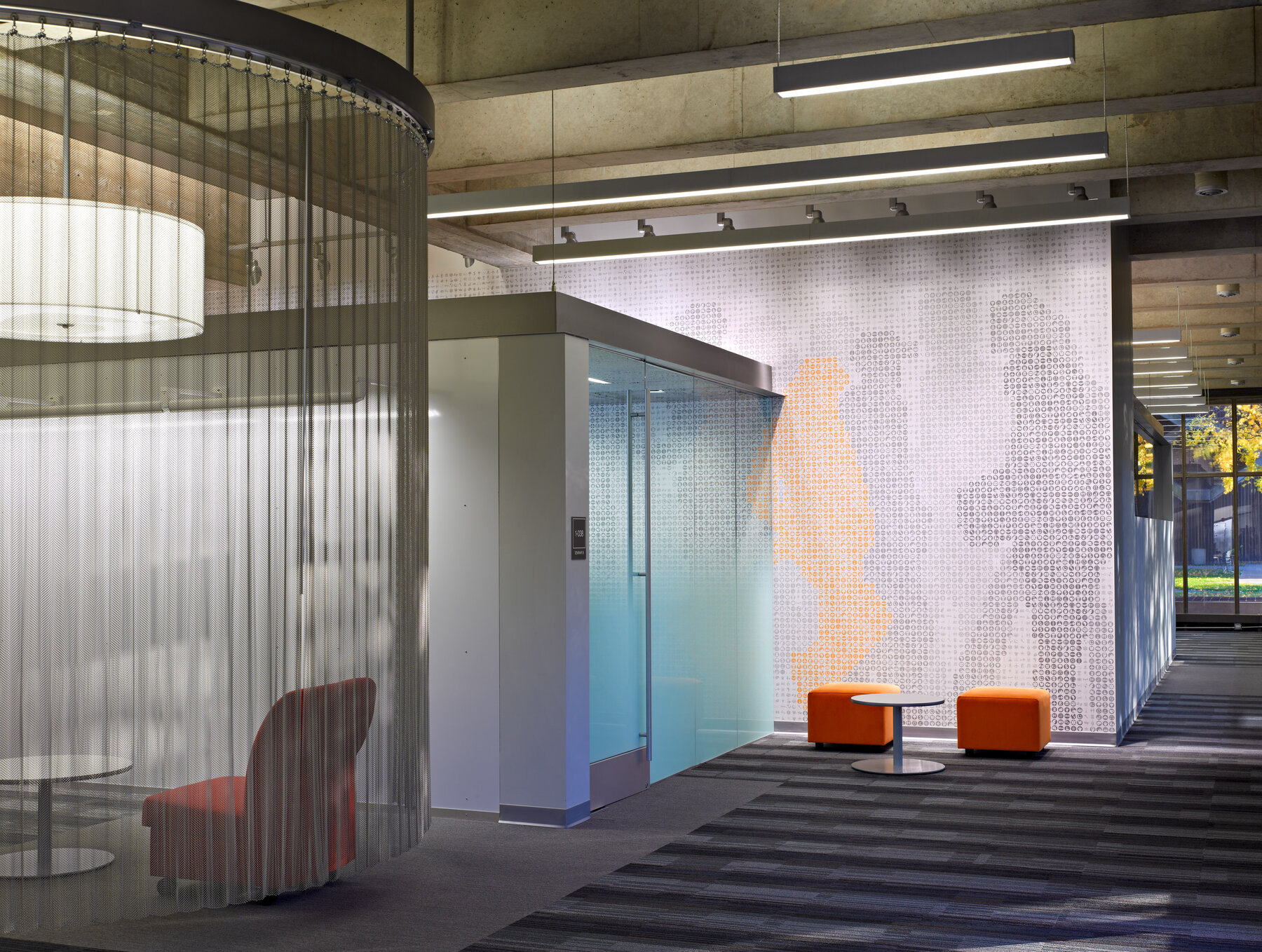 The Richard Daley Library on the campus of the University of Illinois is a modern space with quiet, enclosed study booths, open collaborative spaces and unique design touches like Fabricoil® partitions.