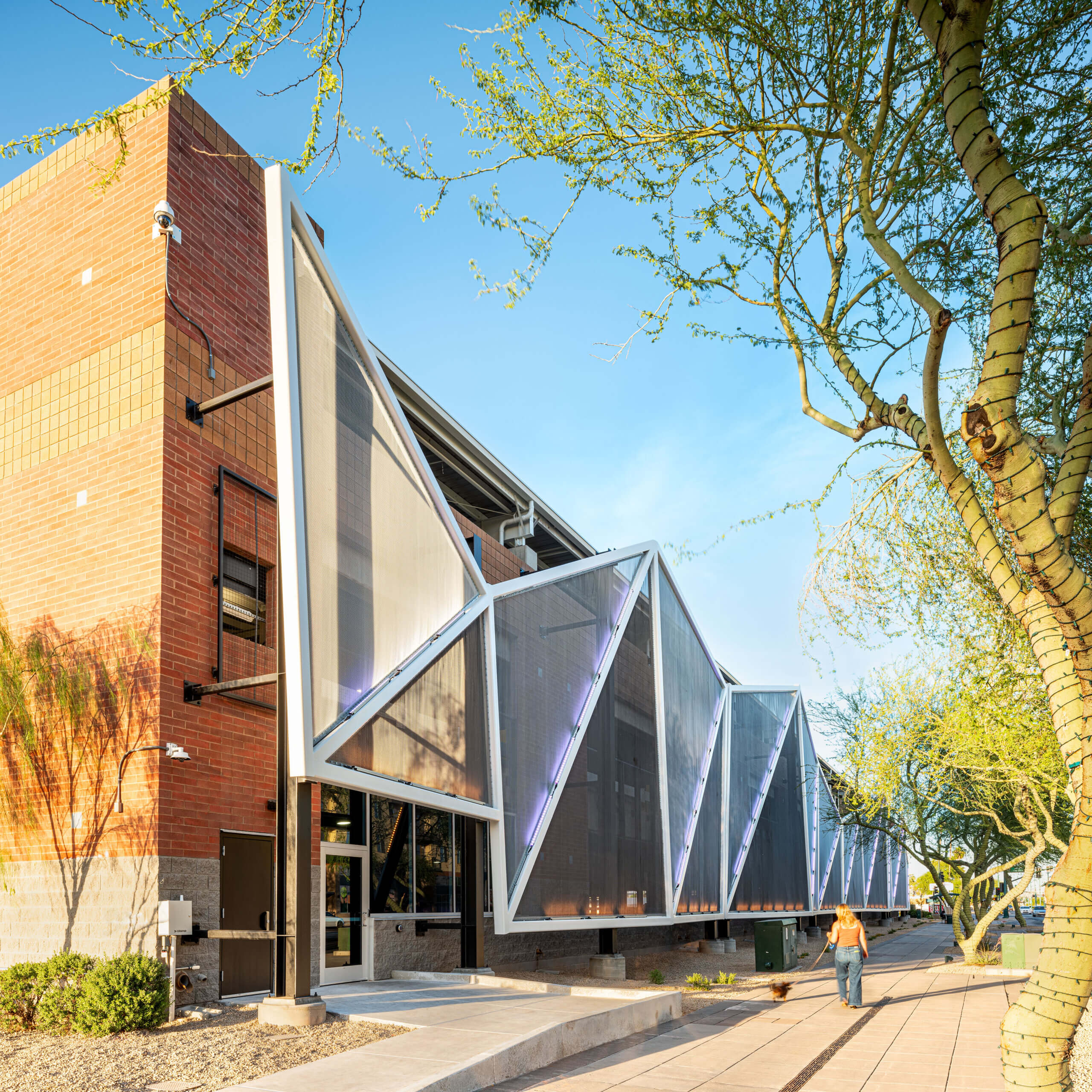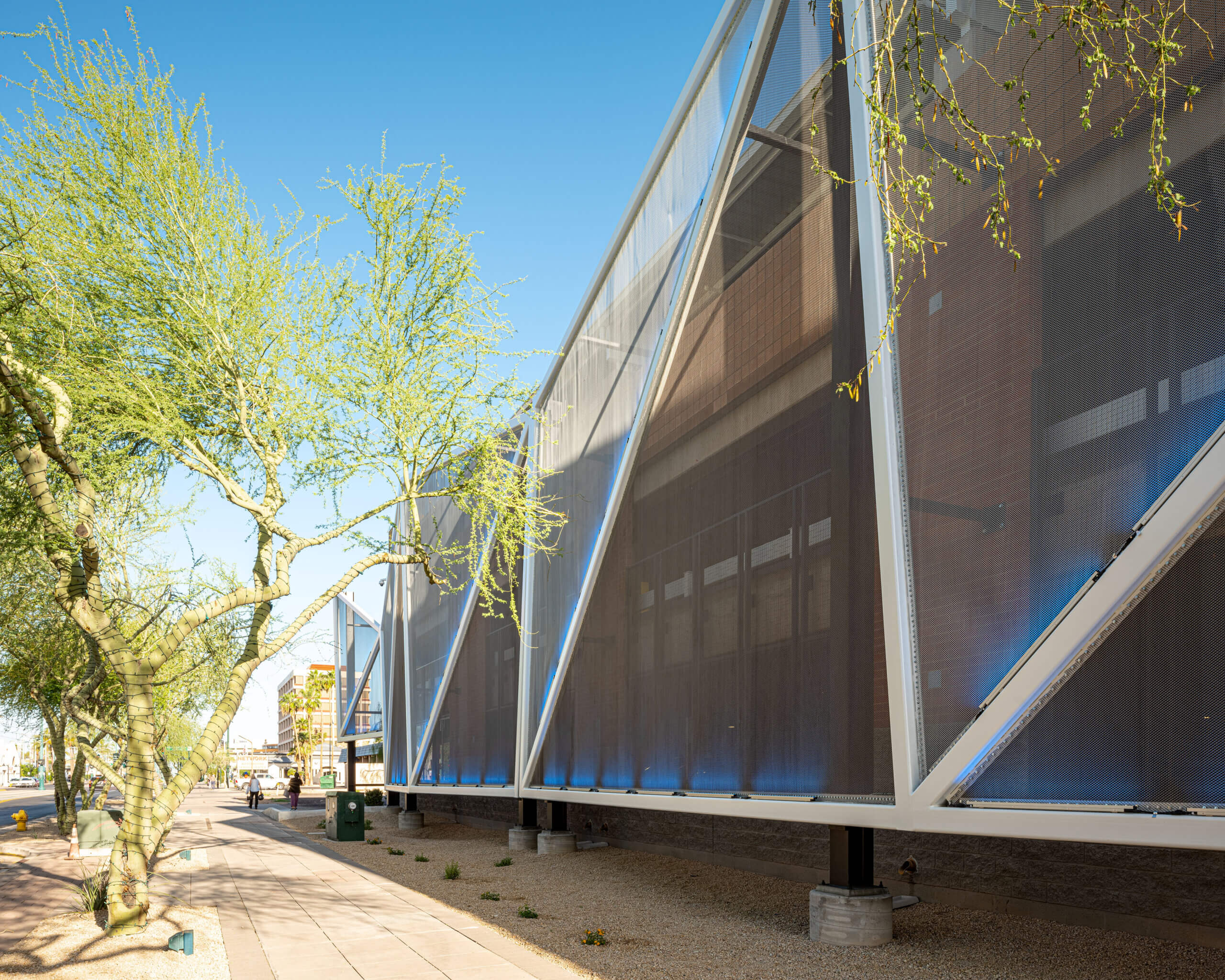 Truly beautiful execution from AF Steel Fabricators, Kitchell and GLHN Architects & Engineers to transform this former car dealership storage building into a secure, modern parking garage that will live as an iconic, district-defining landmark in Downtown Mesa, Arizona for years to come.